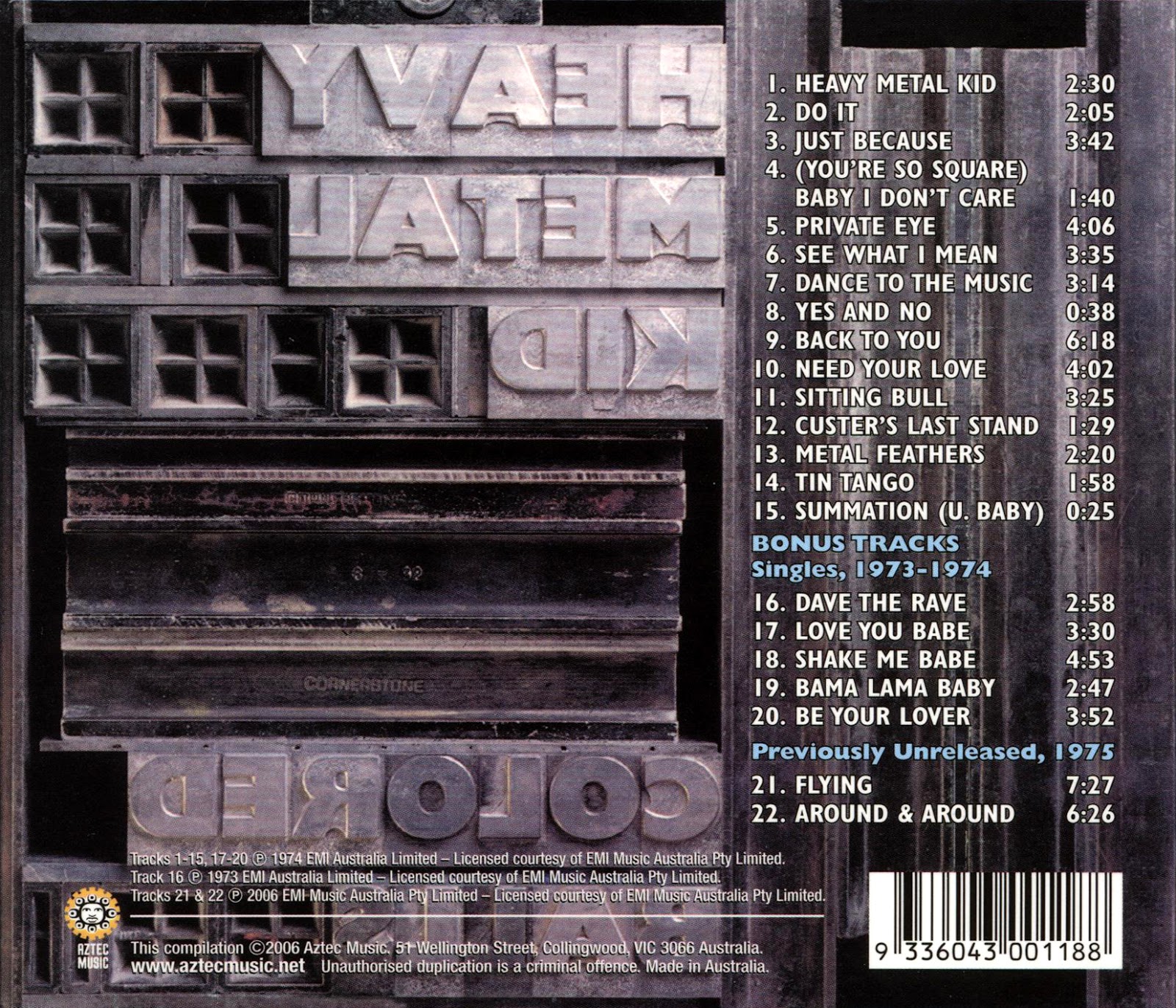 The band managed one more single “Bama Lama Baby / Be Your Lover” before disbanding. This single was thought to be their last recording, until a master tape of an unreleased single “Flying / Around and Around” was discovered. Recorded live in the studio in 1975 with engineer / producer Gil Matthews, these 2 tracks represent the final studio offering from one of Australia ’s greatest bands. Heavy Metal Kid is presented in a 6 panel digi-pak with a 24 page booklet filled with rare photos & liner notes by Ian McFarlane. It has been digitally remastered with 7 bonus tracks.
